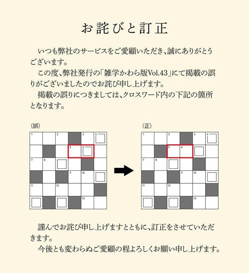 平素は格別のお引き立てをいただき、ありがとうございます。さて、弊社からご案内しております「雑学かわら版 vol43」のクロスワードに誤りがございました。お客様に、ご迷惑をお掛けいたしましたことをお詫びするとともに、下記のとおり訂正させていただききます。たくさんのご応募(ご意見・ご感想)をお待ちしております。