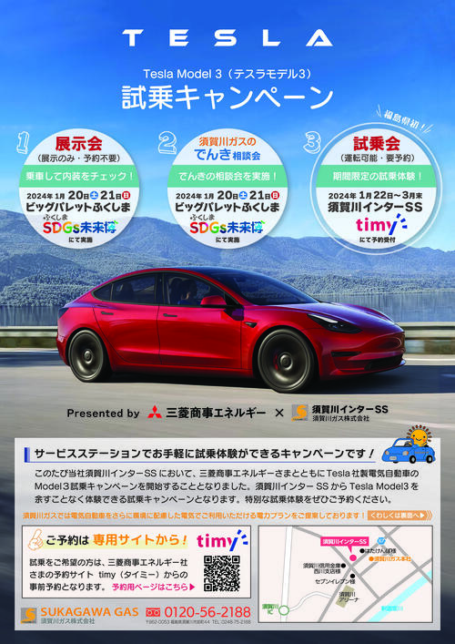 この度須賀川ガスは、三菱商事エネルギー様テスラ社様とともに、福島県初のテスラ社電気自動車ーmodel3ー試乗キャンペーンを実施致します。